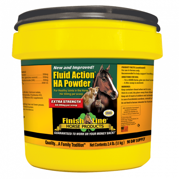 Fluid Action® HA Powder is concentrated, economical, and the best value with a taste that horses love! Fluid Action® HA Powder promotes healthy, well-lubricated joints with 100 mg/serving Hyaluronic Acid, 5000 mg/serving Glucosamine HCl, 200 mg/serving Chondroitin, 1000 IU/serving Vitamin D, 2000 mg MSM, 1000 mg Vitamin C, and D, turmeric and boswellia serrata! It contains no fillers and no artificial coloring. Safe for use in horses, dogs and cats.