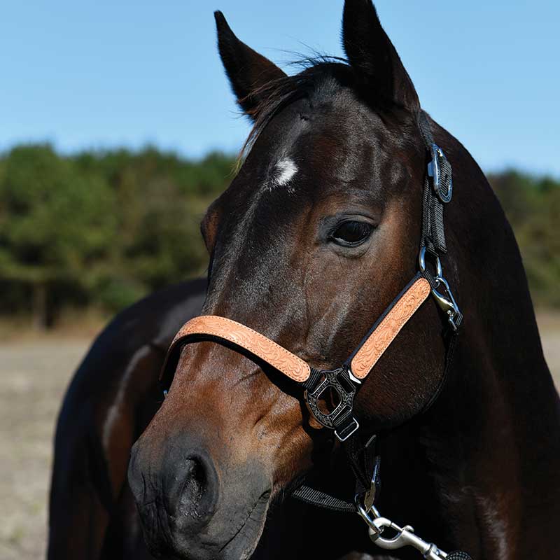 Lami-Cell Western Leather Embossed Halter • PP webbing • Leather embossed overlay on nose and cheek • Suede padded noseband, cheek, and crown • Floral Nickel Plated hardware • Adjustable crown and noseband • Throat latch